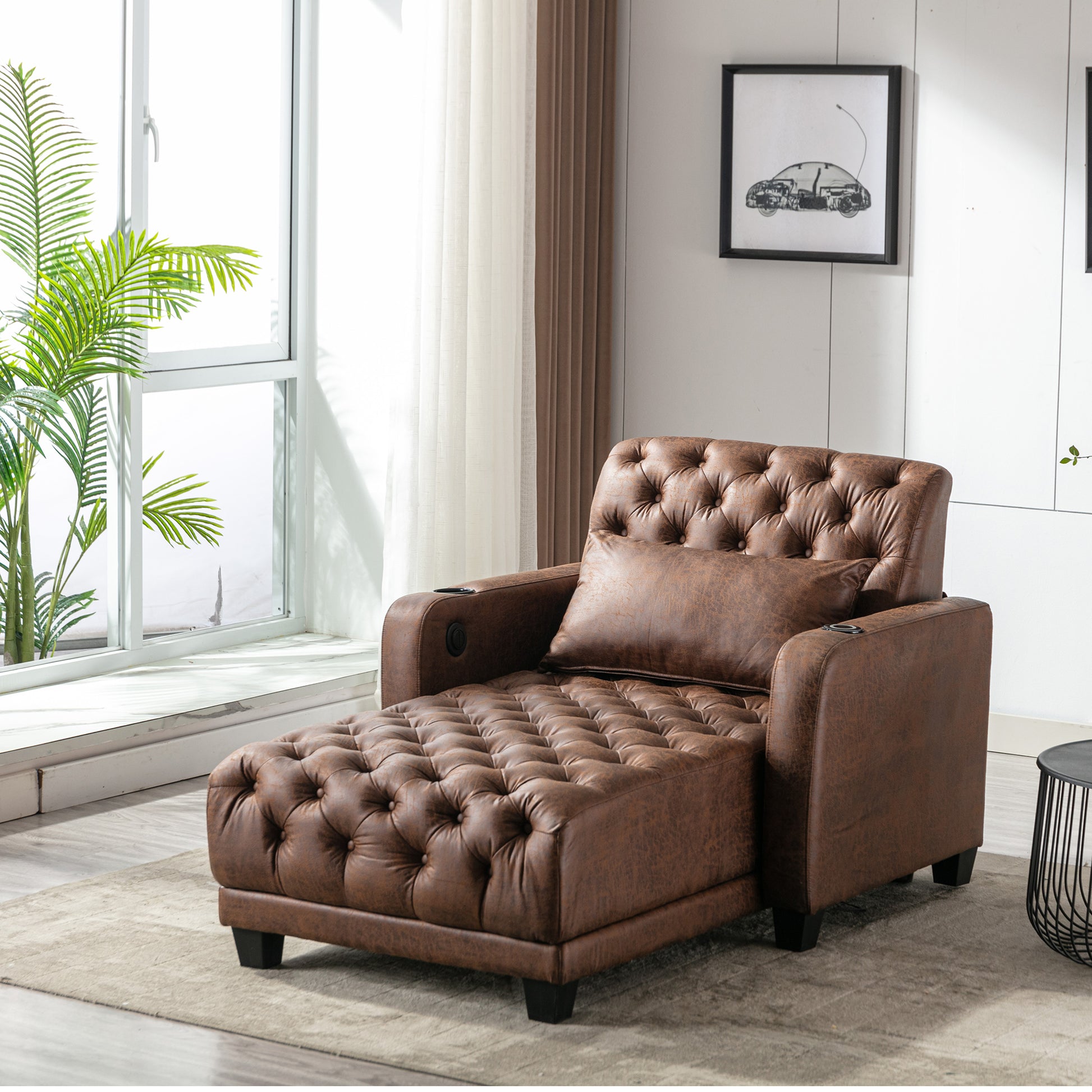 Barry Lounge Chair – Brown Linen Chaise with Tufted Back, Lumbar Pillow & Wireless Charging